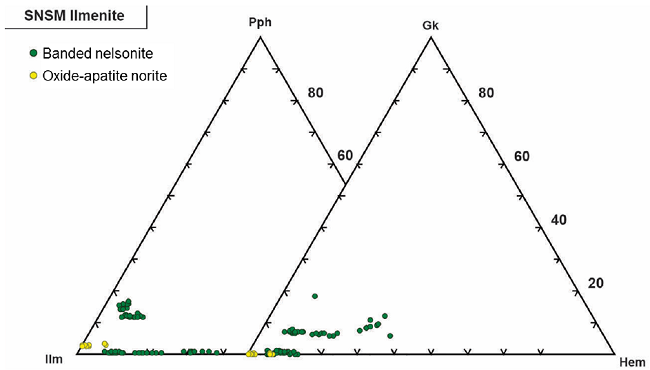 In addition, ilmenite from the banded mineralization style contains between 0.2 and 6.6 wt % MnO which gives the mineral an important pyrophanite component (up to 14.9 mol % Pph, 5.2 mol % Pph on average), and up to 5.1 wt % MgO which translates into a remarkable geikielite component (up to 18.2 mol % Gk, 4.7 mol % Gk on average). In contrast, ilmenite from the oxide-apatite norite shows much lower pyrophanite and geikielite components (3.2 and 0.2 mol %, on average, respectively), since very low values of MnO (1.5 wt % on average) and MgO (below 0.1 wt % on average) were obtained (Figure 9).