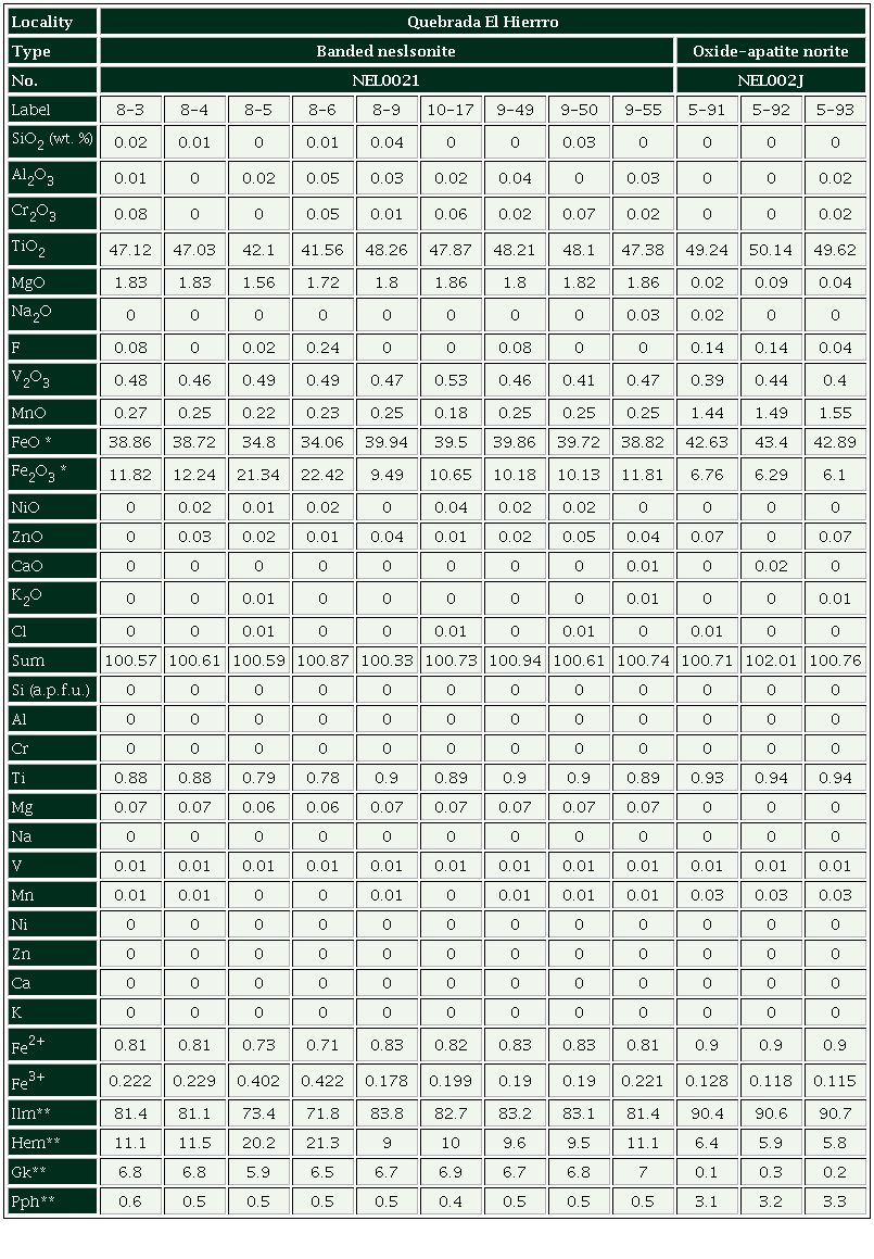 Valid analyses of the patchy exsolutions in the banded nelsonite, and of the lamellae oxide-apatite norite mineralization style could not be obtained.