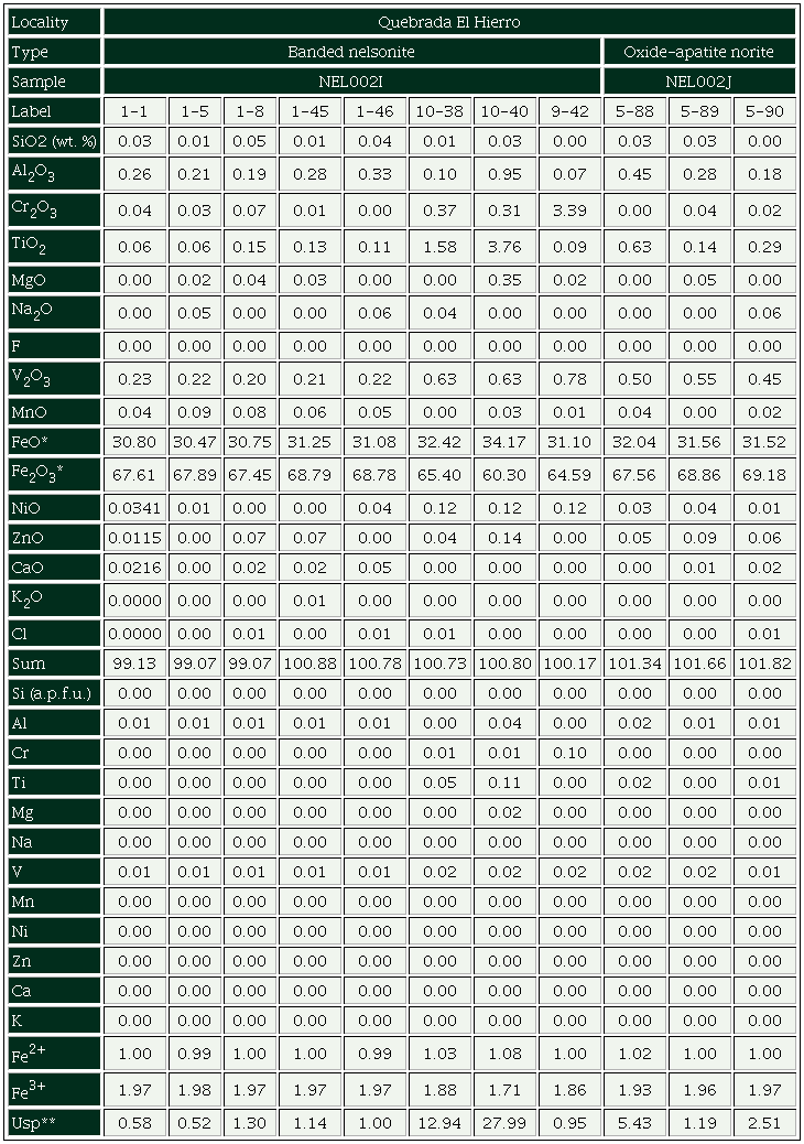 Chemical analyses of the mineral phases of samples NEL-002-I and NEL-002-J were performed using a JEOL JXA-8230 electron microprobe (EMP) at the CCiT-UB, equipped with four wavelength dispersive spectrometers (WDS) and one energy dispersive spectrometer (EDS) operated at 20 kV accelerating voltage, 15 nA beam current and with a beam diameter of 5 μm, and 1 μm for minute mineral grains. The analytical standards used were: hematite (Fe), rutile (Ti), periclase (Mg), rhodonite (Mn), corundum (Al), Cr2O3 (Cr), metallic vanadium (V), diopside (Si), sphalerite (Zn), NiO (Ni), wollastonite (Ca) and metallic Nb (Nb). The correction procedure PAP (Pouchou and Pichoir, 1991) was used to convert specimen intensity ratios into concentrations. The Ti Kβ overlap on the V Kα peak was corrected by the microprobe software. The structural formulae calculations of magnetite were performed on the basis of 4 oxygens, and of ilmenite and hematite, with 3 oxygens; and using the criteria of Carmichael (1966) for the Fe3+ estimation. The ilmenite (Ilm), hematite (Hem), geikielite (Gk) and pyrophanite (Pph) components were calculated as follows: Ilm=(Fe2+/(Fe2++Fe3++Mg+Mn))·100, Hem=(Fe3+/(Fe2++Fe3++Mg+Mn))·100, Gk=(Mg/(Fe2++Fe3++Mg+Mn))·100, Pph=(Mn/(Fe2++Fe3++Mg+Mn))·100; where Fe2+, Fe3+, Mg and Mn are in cations per formula unit. The calculation of the ulvöspinel (Usp) component in magnetite was obtained following Stormer (1983). The composition of Fe-Ti(-V) oxides was plotted in triangular diagrams using the CSpace software (Torres-Roldán et al., 2000). Mineral and end member abbreviations are after Whitney and Evans (2010).