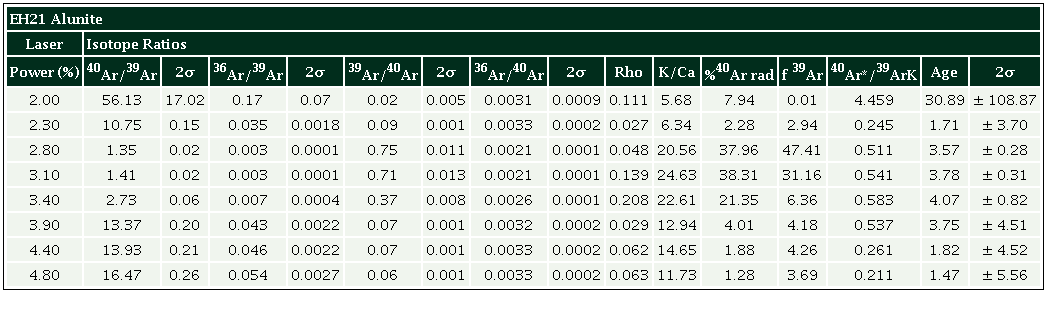 Two pure alunite mineral separates from outcropping epithermal alteration material from the Xoconostle prospect were dated by 40Ar/39Ar geochronology (Table 1). The analyzed samples correspond to alunite crystals separated from deep hypogene advanced argillic alteration assemblages adjacent to the main massive quartz ore body in the high sulfidation epithermal deposits. These samples were massive, not pulverulent, aggregates of white to slightly rose-hued fine-grained and euhedral to subhedral platy alunite crystals. Hence we classify the advanced argillic alteration assemblage to which this alunite belongs as deep hypogene (e.g., Sillitoe, 1993, 2015).