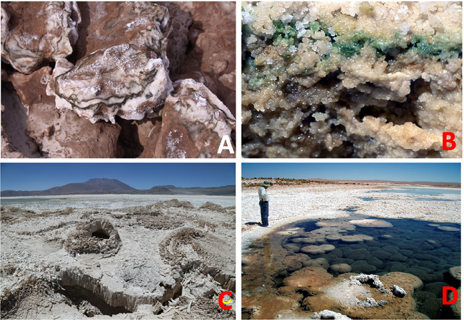 Estas sales son un agente principal de los procesos de meteorización y erosión de las rocas, formación de suelos y de diversas estructuras. En algunos casos, sus altas concentraciones constituyen los yacimientos de minerales industriales más importantes del país. Adicionalmente, estos ambientes salinos, asociados a condiciones climáticas de hiperaridez y aridez, constituyen un hábitat favorable para el desarrollo de una excepcional, abundante y variada microbiota (Figura 1).