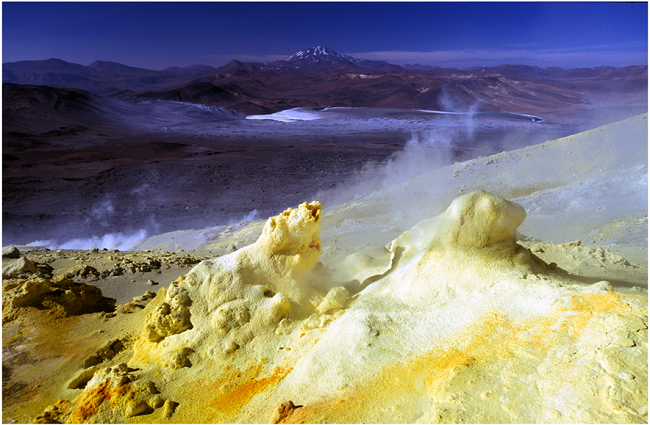 Los principales solutos que aporta el volcanismo son sulfatos (principalmente yeso) cloruros (mayoritariamente halita), carbonatos asociados a fuentes termales y boratos que, en el caso de Chile, son exclusivamente boratos dobles de Na y Ca (Chong, 2000)