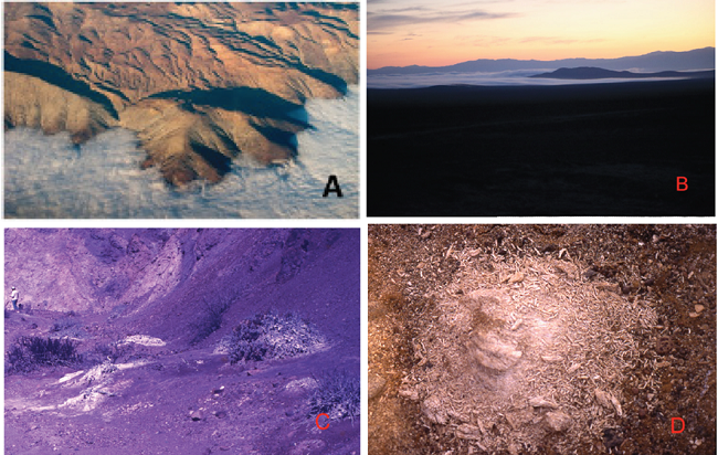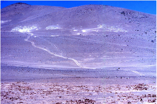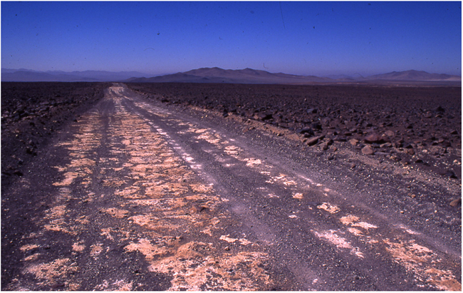 Estos cuerpos evaporíticos se han formado en la parte distal de sistemas aluviales provenientes de la Precordillera y la Alta Cordillera que tienen, como nivel de base, la Depresión Central, mayoritariamente en la Pampa del Tamarugal. Su límite occidental es el borde de la Cordillera de la Costa, en la parte más baja de la Depresión Central. Su recarga es ocasional e irregular y el recurso hídrico ha sido explotado intensamente. En el presente están en plena etapa de fosilización (Figuras 36 y 37). Ejemplos son los salares de Llamará, Pintados (20°33’S/69°38’W), Bellavista (20°46’S/69°37’O) (Figuras 36 y 37), Obispito (19°38’S/69°57’O) y Sur Viejo (20°53’S/69°33’O) en la Pampa del Tamarugal, y los salares del Carmen (23°39’S/70°17’O), Navidad (23°44’S/69°55’O) más al sur. Los salares de ubicación más septentrional de este tipo, entre Arica y Quebrada Tiliviche (19°29’S/70°06’O), están cortados por profundas quebradas y se han denominado “Salares de las Pampitas” (Chong, 1984, 1988) (Figura 38).