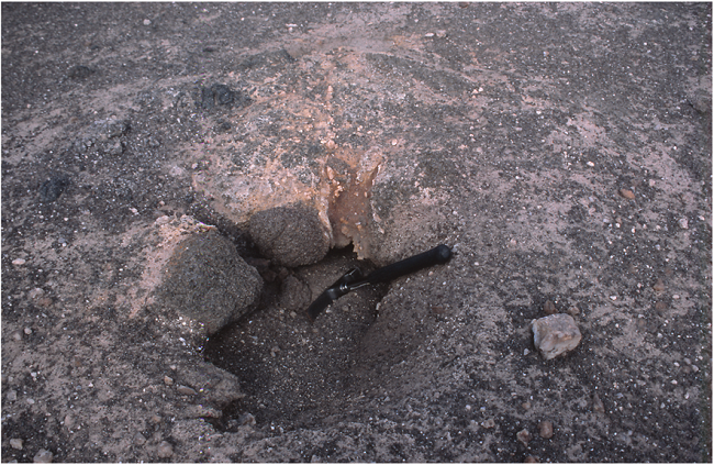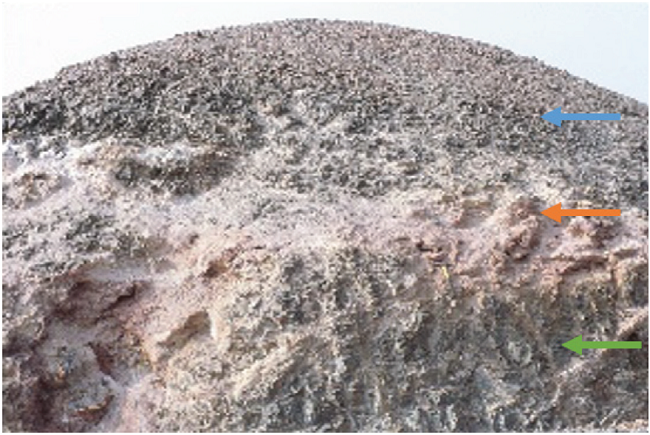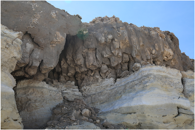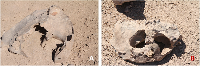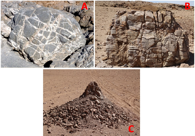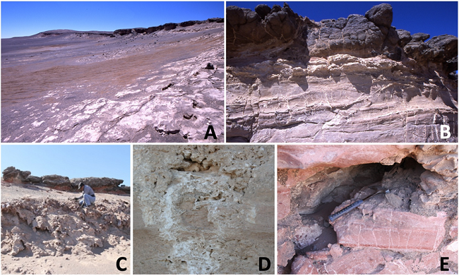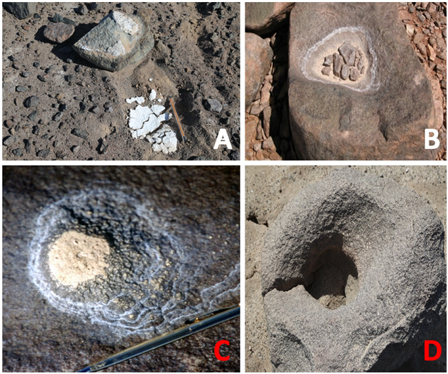 Otro caso es el conocido mecanismo de cristalización y recristalización de sales por la acción del agua y por los cambios de temperatura en las grietas de las rocas, lo que las fragmenta y destruye (Figuras 25A a la 25C). Finalmente, como se ha descrito, la acción de los gypsisols genera la destrucción mecánica de rocas del basamento. Cuando el viento va denudando los gypsysols, quedan expuestas estas rocas destruidas. (Figuras 26A y 26B).