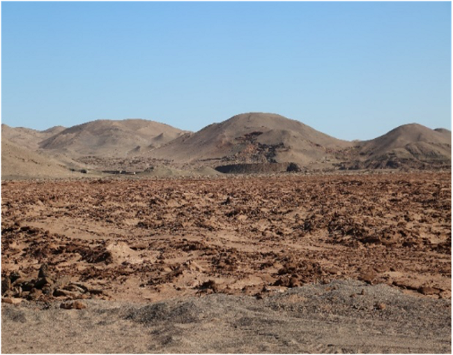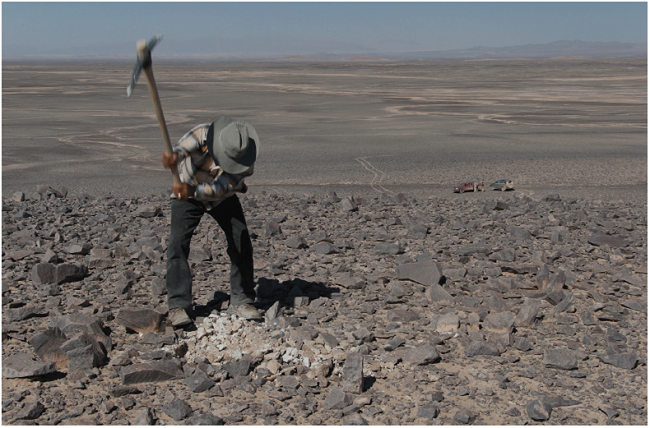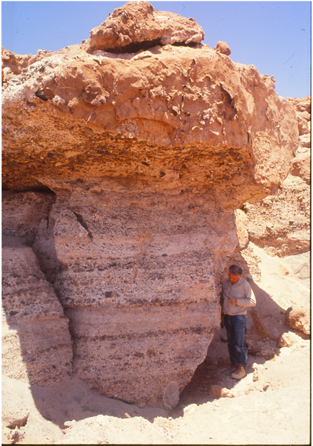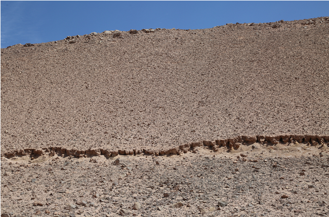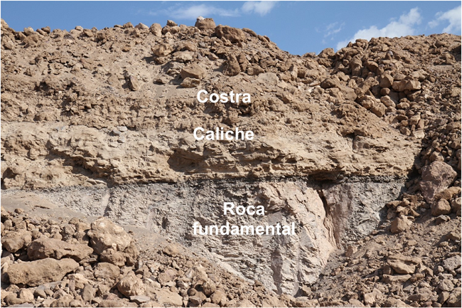 Lo más común que se observa es que, desde la superficie, aparece un regolito de litología homogénea, que corresponde a la roca del basamento subyacente. Solo algunos centímetros por debajo de este regolito aparece el gypsisol, localmente friable, que penetra la roca del basamento hasta varios metros de profundidad, destruyéndola físicamente y se desconoce si está asociada a alguna actividad química. Esto hace que los clastos de la roca del basamento aparezcan como flotando sobre el horizonte salino (Figuras 21 y 22). Finalmente, en los cerros de la costa y en quebradas que desembocan en el mar, se reconoce una cubierta sedimentaria, también como un gypsisol, como por ejemplo, en los casos de Coloso (23°45’S/70°27’O) y Patache (20°48’S/70°11’O) (Figura 23). En este caso se asume un origen marino de las sales y datos isotópicos de S y O, como lo comprueban Rech et al., (2006). A su vez, la isotopía de S y O indica un origen volcánico para sulfatos descritos de la base de los gypsisols (Barraza, 2006). No se conoce información sobre la edad de los gypsisols y se les asume una edad pliocena-pleistocena.