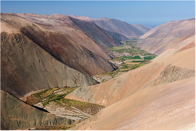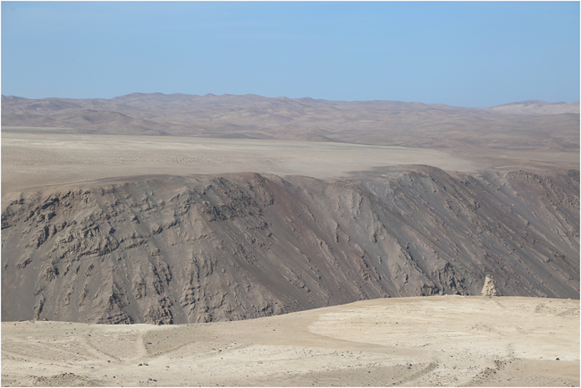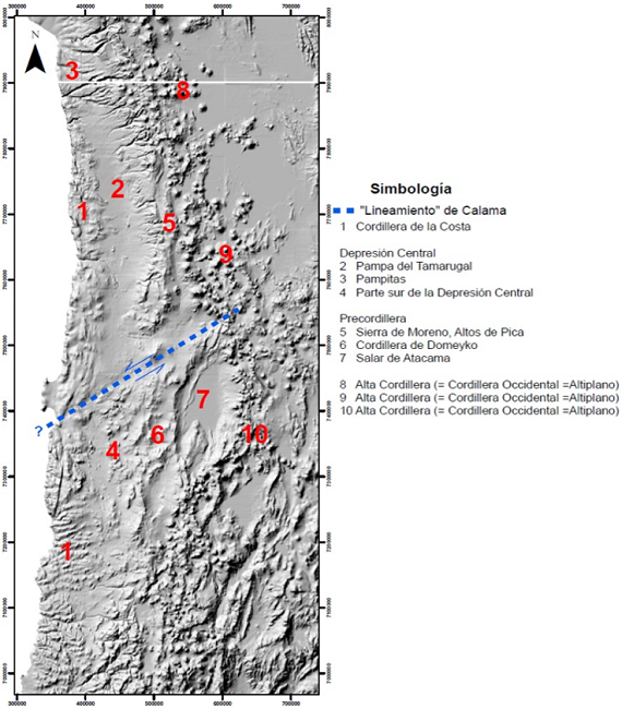 Depresión Central. Es un territorio deprimido, limitado en parte por estructuras, entre la Cordillera de la Costa y la Precordillera, de unos 50 km de ancho y altitud promedio del orden de 1000 m s.n.m. Es el nivel de base principal antes del Océano, con pendiente regional hacia el oeste y está rellena por los aportes sedimentarios especialmente desde la Precordillera y Alta Cordillera. En su parte norte, la Pampa del Tamarugal tiene un relieve plano, endorreico y muy escasos relieves islas (Figura7). En el sector más septentrional está atravesada por profundas quebradas en sentido E-O y es el nivel de base de profundas quebradas de la Precordillera. Desde aproximadamente los 22°36’S, presenta numerosas serranías y cerros islas, en partes alineados estructuralmente (Figura 8); rasgo que se acentúa hacia el sur y, desde los 25°24’S pierde su identidad, formando parte de un relieve que se eleva, en forma continua desde la Cordillera de la Costa hacia el este. La Depresión Central posee un importante sistema estructural de su basamento principalmente con fallas NS que no está evidenciado debido a la cubierta aluvial.