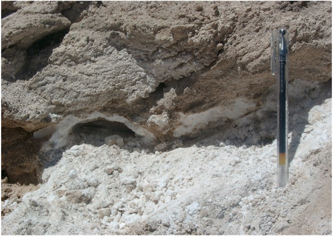 Las descripciones asumen una afinidad sedimentaria única con cambios litológicos y salinos relacionados con la evolución de los depósitos (Ericksen 1981; Chong 1984; Van Moort 1985). La unidad “chuca”, descrita también como “panqueque”, está formada por material clástico de grano fino, anhidrita, yeso y menor halita y, por sus características, en este trabajo, lo asimilamos al suelo tipo gypsisol. Está muy bien cementado y puede incluir en su base horizontes de tenardita, mirabilta, ulexita. Su espesor varía desde 60-80 cm hasta más de 1.5 m. En algunos sectores presenta polígonos de desecación muy profundos y, localmente, sobreyace directamente a los niveles de caliche. Costra y caliche son unidades distintivas. Sin embargo, en algunos perfiles pueden formar un capítulo único de sedimentación con una diferenciación debido a lixiviación vertical. La “costra” está enriquecida en sulfatos, mientras que el “caliche” subyacente incluye sales más solubles como nitratos y cloruros (Figuras 43, 44 y 45).