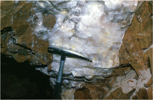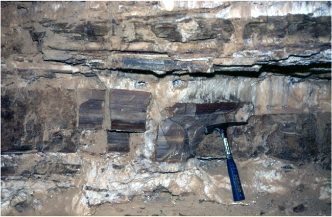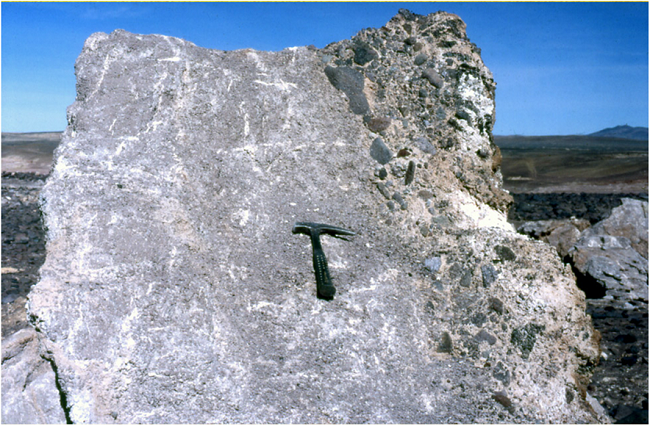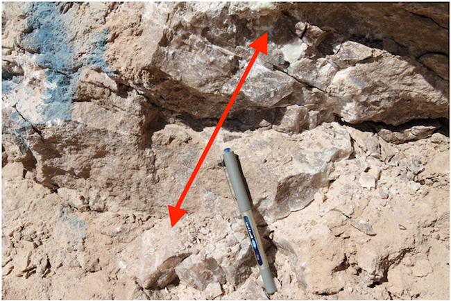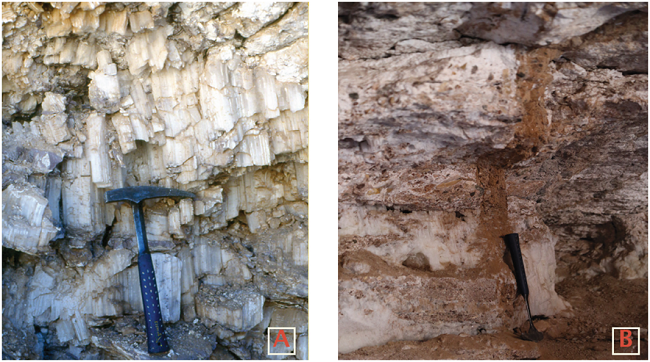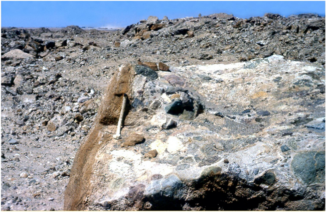 En los yacimientos de nitratos y en otros sectores del desierto se observan los llamados diques de inyección o neptúnicos. Consisten en material detrítico y salino inyectado, en condiciones de presión, desde fluidos superficiales. Su color es pardo en distintos tonos. Algunos de ellos muestran zonación indicando procesos repetidos de inyección, otros tienen una composición homogénea de materiales detríticos finos cementados por sales. Fueron descritos originalmente como “diques de barro” por Ericksen (1983). El más característico es el que se presenta en los yacimientos de nitratos con alta concentración de esa mena y hay sectores en los que la explotación se concentró casi exclusivamente en estos cuerpos (Figura 27).