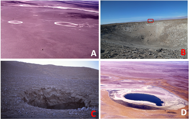 Las estructuras más características de este tipo son las del Salar de Atacama, donde actualmente están en desarrollo (Figura 28A) o han formado lagunas (Tebenquiche, 23°08’S/68°15’O) (Figura 28D), y las del “Ojo de Agua” o Laguna de Chiu Chiu (22°20′ S/68°39′ O). En el área de Quillagua (21°39’S/69°32’O) se conocen varias estructuras fósiles de este tipo que alcanzan diámetros de más de 200 m (Figura 28B). También se observan en evaporitas jurásicas en la Cordillera de Domeyko, en el Salar de Llamará (Figura 28C), en el Salar Grande asociadas a sistemas de fallas y en la Cordillera de la Sal (22°57’S/68°18’W) donde forman un complejo sistema de cavernas en el subsuelo.