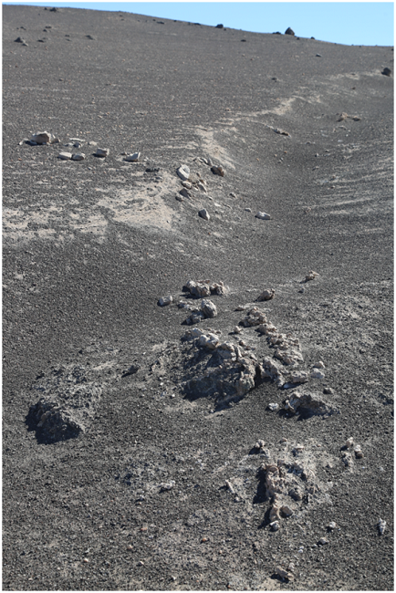 En el caso de acumulación de sulfatos en la base de clastos en la superficie, se interpreta que estos se depositan por acción del viento y de la Camanchaca, condensándose sobre los clastos calentados durante el día. Los pequeños flujos de agua salina los disolverían y, por gravedad, se desplazarían por los bordes de los clastos y concentrarían, por evaporación, las sales bajo ellos (Figura 24A).