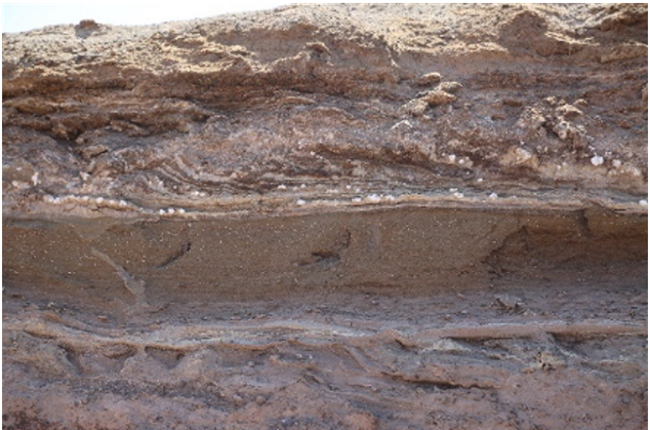 Otro tipo de yacimiento sedimentario corresponde a caliche incluido en sedimentitas lacustres que infrayacen a las costras salinas de un salar. Este tipo de depósito solo ha sido reconocido recientemente y fue explotado en forma intensiva hasta el año 2017 (Figura 42). Otros depósitos en paleolagos corresponden a aquellos formados en la parte distal de antiguos conos aluviales de eje norte-sur, en la Depresión Central. Estos lagos fueron relativamente profundos e incluyen estructuras de slumping (Figura 54).