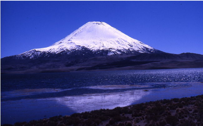 Alta Cordillera ( = Cordillera Oeste = Altiplano = Andes = Cordillera Principal). Está constituida por un plateau volcánico-sedimentario a unos 4000 m s.n.m., pendiente regional hacia el oeste denominado Altiplano (Lamb y Hoke, 1997) (Figura 11). Se dispone sobre un basamento Mesozoico-Paleozoico y se le superponen edificios volcánicos del Mioceno - Presente, algunos con altitudes cercanas a los 7000 m, y salares (Figura 12). El Altiplano está mejor representado en la parte central del Norte Grande y desaparece hacia el sur. Hacia el norte, cubre parte de la Precordillera y, en su extremo más septentrional (Arica, 18°28’S/70°18’O), prácticamente llega a la costa.