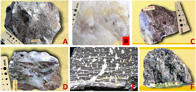 Los YNY del tipo en roca que se emplazan en algunas de las rocas volcánicas paleógenas no guardan ninguna relación con algún proceso de sedimentación asociado, Están exclusivamente en estas rocas como vetas, mantos y cuerpos irregulares (Figura 55A).