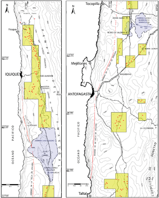 Los depósitos se pueden ubicar con criterios geográficos, geomorfológicos y geológicos. Geográficamente se ha decidido ubicar las Oficinas Salitreras porque éstas incluyen los yacimientos (pampas), las instalaciones de beneficio, los campamentos, las áreas de relaves (tortas) y las minas (calicheras) (Figuras 49, 50 y 52). Los yacimientos se extienden a lo largo de una franja de unos 700 km, entre Pampa Tana por el norte (19°23’S/70°08’O) hasta aproximadamente Cerro La Peineta (25°00’S/70°08’O), por el sur. Si se considera que en el pasado no se explotaban leyes inferiores a 14-15% de nitratos y se conocen yacimientos cubiertos por sedimentos, esta franja debe estimarse continua. El límite septentrional es tentativo toda vez que algunos Salares de las Pampitas en la Depresión Central (25°24’S/68°40’O) contienen anomalías significativas de nitratos y yodo. La principal discontinuidad N-S de esta franja se debe a una estructura continental probablemente asociada al Lineamiento Calama - Olacapato - Toro (Salfity, 1985), que crea un segment}o separado de yacimientos (Figuras 2 y 53).