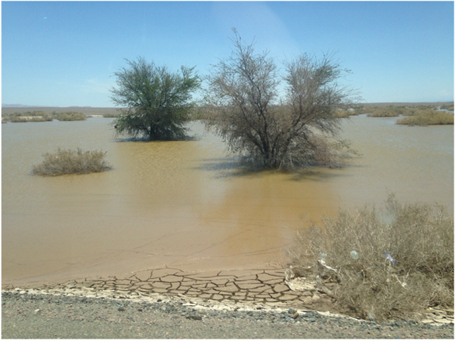 La Camanchaca, formada por minúsculas gotas de agua en suspensión, al tomar contacto con cuerpos que interceptan su paso, se condensan y crean comunidades biológicas costeras (Cereceda, 2002). Formada sobre el mar, la Camanchaca se mueve por advección hacia las montañas costeras, estacionándose a lo largo del acantilado costero (Cereceda, 2002) (Figura 13A). Su expansión espacial máxima ocurre en invierno y la mínima, en verano (Cereceda et al., 2008). Sträter et al., (2010) describen el alto contenido de sulfatos muy menor de nitratos y cloruros y con un pH ácido (2,5-3,5) del agua contenida en estas nieblas, atribuyéndolo a contaminación con el spray marino. Nuestras observaciones corroboran esta contaminación con el reconocimiento de la destrucción de vegetación por exceso de sal en sectores costeros de la Cordillera de la Costa en Taltal (25°24’S/70°29’O). (Figuras 13C y 13D). Este tipo de niebla es responsable de diversos procesos y estructuras asociados a sales en el ambiente desértico.