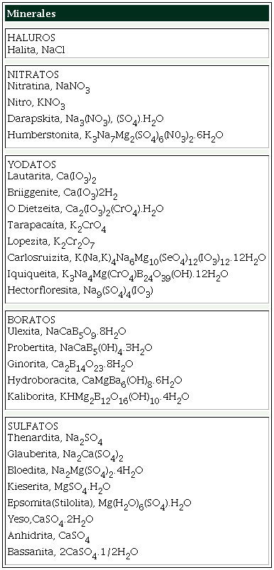 Las sales de estos depósitos son solubles en agua y corresponden, de manera principal, a nitratos, iodatos, cromatos y dicromatos asociadas a otras más comunes como cloruros, sulfatos y boratos. La presencia de cloratos y percloratos es detectada en los análisis químicos, pero no se conoce su expresión mineralógica. No hay un estudio definitivo sobre los elementos trazas, incluyendo el litio. Los cationes principales son Na+, K+, Ca+2 y Mg+2.