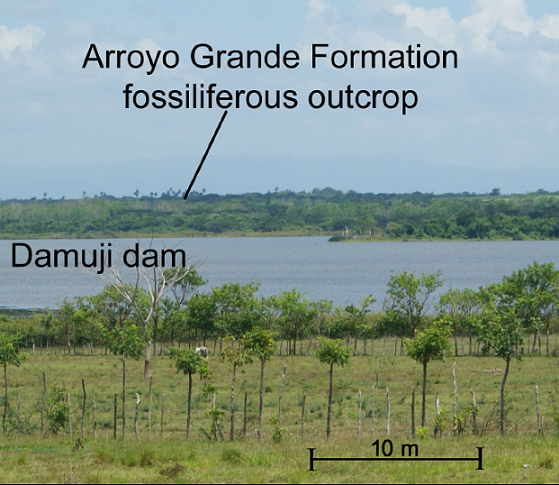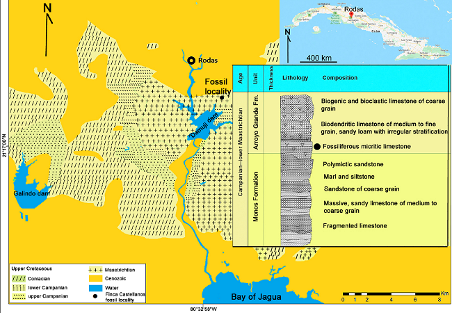 The fossils herein described were collected in the Arroyo Grande fossil locality (Figure 2). situated near Finca Castellanos, about 4 km southeast of the town of Rodas in Cienfuegos Province, Central Cuba (Figures 1 and 2). Specimens were collected in situ from calcareous detritus of the Arroyo Grande Formation, which is characterized by the alternation of limestone, sandstone, conglomerate, and marl (Linares-Cala, 2014). These sediments were deposited on a neritic platform that originated when the sea covered part of the Proto-Caribbean extinct volcanic arch in the Late Cretaceous (Iturralde-Vinent, 2006). Bioherms and other reef structures are locally found across limestone outcrops in the Arroyo Grande and other formations of similar age in the region (Linares-Cala, 2014).