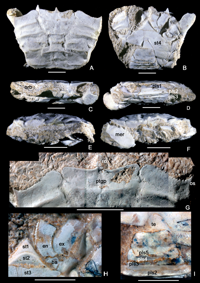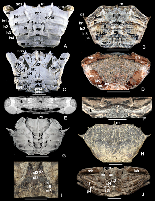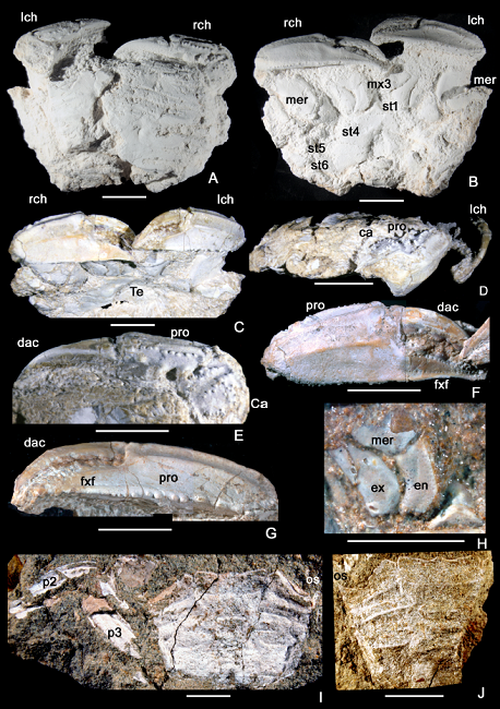 ba = basis, br = branchial ridge, ca = carpus, crr = cardiac ridge, cx =coxa, da = dactylus, e1e =cervical groove, ebr = epibranchial ridge, eg/br = epigastric/branchial ridge; en = endopod, epr = epigastric ridge, ex = exopod, fxf = fixed finger, her = hepatic ridge, intr = intestinal ridge, isq = ischium, Lch = left cheliped, Ls = lateral spines 1-4, mer = merus, msbr = mesobranchial ridge, msgr = mesogastric ridge, mtbr = metabranchial ridge, mx3 = third maxilliped, ok = outer keel of propodus, orb = orbit, os = orbital spine, p = pereiopods 2-4, pls = abdominal somites 1-6, pr = propodus, ptgr = protogastric ridge, ptp = protogastric process, rch = right cheliped, ro = rostrum, rt = row of tubercles 2 and 3, sos = suborbital spine, st = sternites 1-7, te = telson, ugr = urogastric ridge.