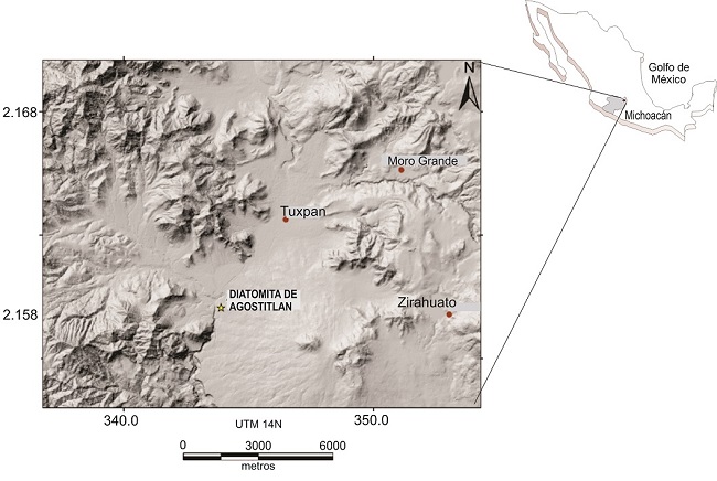 La diatomita de Agostitlán (Figura 2) está ubicada en el sector meridional del estado de Michoacán (19°32'08.96" N y 100°29'31.99 O a una altitud de 1711 m.s.n.m.). Se inserta dentro de un graben orientado NO-SE que se alinea con la caldera de los Azufres. Este graben NO-SE corta las estructuras E-O que limitan el lago de Chapala y Cuitzeo, los dos lagos activos más grandes de México, así como el extinto lago de Acambay. En los límites de éstos afloran diatomitas asignadas al Neógeno-Cuaternario (Israde et al., 2010b), lo que permite la reconstrucción de la evolución y el ambiente en el que se desarrolló la abundante fauna de vertebrados que vivió en el entorno de ellos (Miller Wade y Carranza-Castañeda, 1984: Mercer et al., 2014).