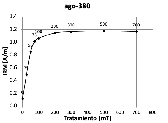 La Magnetización Remanente Isotermal (IRM, por sus siglas en inglés) depende de la concentración de minerales ferrimagnéticos. La forma de las curvas de adquisición de esta remanencia es útil para inferir la presencia de minerales de alta coercitividad (hematita y/o goetita) o de minerales multidominio. En la Figura 10 puede observarse cómo la muestra se satura en campos cercanos a 300 mT. En algunos casos lo hace a partir de los 200 mT, alcanzando valores cercanos al 100%, lo que indica que se tiene la presencia principalmente de minerales magnéticamente blandos (ferrimagnéticos), muy probablemente titanomagnetita. En general, las gráficas son muy similares en cuanto a la forma para todas las muestras y no hay diferencias contrastantes apreciables.