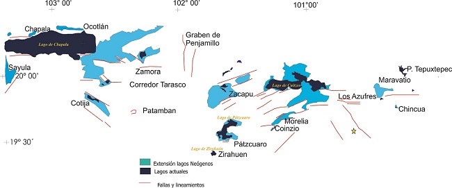 La localidad de estudio se encuentra en el Centro occidente de México, donde, desde el Paleoceno al Cuaternario, la fisiografía se ha transformado como resultado de la compleja evolución geodinámica del margen del Pacífico y la fragmentación de la placa de América del Norte (Aranda-Gómez et al., 2005). Las principales provincias fisiográficas en el centro de México están constituidas por Cuencas, Cordilleras y depresiones tectónicas de orientación N-S y NNO-SSE (Aranda-Gómez et al., 2005) y la Sierra Madre Oriental. Esta última provincia, junto con la Miocénica de la Sierra Madre Occidental y el Altiplano central Mioceno, constituyen los límites del cinturón Volcánico Transmexicano (CVTM), cuya principal actividad del CVTM se desarrolló después de 12 Ma en la región centro-occidental (Garduño-Monroy y Gutierrez-Negrín, 1992). El paisaje de la región está caracterizado por grandes edificios volcánicos y hacia el norte la fragmentación genera fosas y semigrabens como productos de un régimen transtensivo NO-SE, durante el Mioceno-Plioceno formando un punto triple. El brazo E-O del punto triple constituye el denominado Graben Chapala-Acambay, localizado en el Centro-Occidente de México (Garduño et al., 1993), desde los márgenes Oeste del Lago de Chapala en Jalisco hasta la población de Acambay, Estado de México (Figura 1). Dentro del Graben se han establecido cadenas de lagos donde la actividad volcánica y climática propició el depósito de hasta 50 metros de diatomitas laminares, destacando las de Acambay, las cuales están muy tectonizadas (Rodríguez- Pascua et al., 2010).