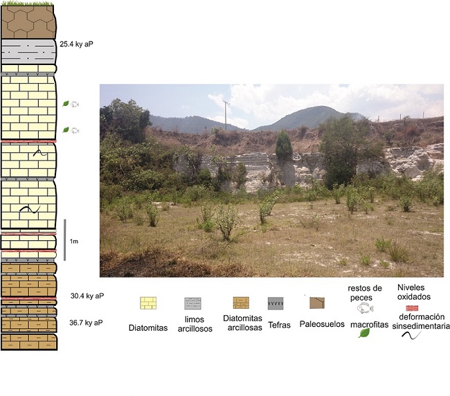 Cabe señalar que la accesibilidad a las paredes del afloramiento fue limitada h acia la cima de la secuencia, sin embargo, un ulterior acceso a la mina permitió cubrir el espesor total del yacimiento. Por lo anterio , el nivel 0 es la base de la columna y la cima alcanza los 6.90 m de espesor. Se obtuvieron tres fechas: la primera a 40 cm de la base de 36,450 años cal aP., a 1 m se obtuvo una edad de 30,045 años cal aP. y la cima a 650 cm corresponde a 25,305 años cal aP. Las tres permiten asignar un intervalo de tiempo en el que se llevó a cabo el depósito de la diatomita.