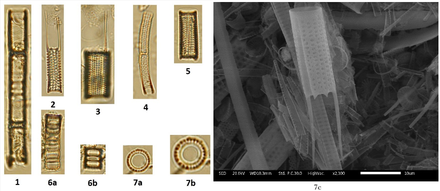 Se analizó el registro taxonómico de la diatomita de Agostitlán, obteniéndose un listado de 31 especies con predominancia de formas Centrales planctónicas, siendo características y dominantes Aulacoseira spp. y Stephanodiscus spp. La flora ticoplanctónica incluye formas de la familia Fragilariaceae (Williams y Round 1987) y, en escasos porcentajes, algunas especies perifíticas (Kociolek et al., 2014) que incluyen a Cocconeis spp., Navicula spp., Gomphonema spp., Epithemia spp. y Cymbella spp. y algunos géneros de preferencia bentónica como Nitzchia spp., Sellaphora spp, Stauroneis spp. La diatomita presenta una abundancia de hasta 1.8x107 valvas/ g de sedimentos secos.