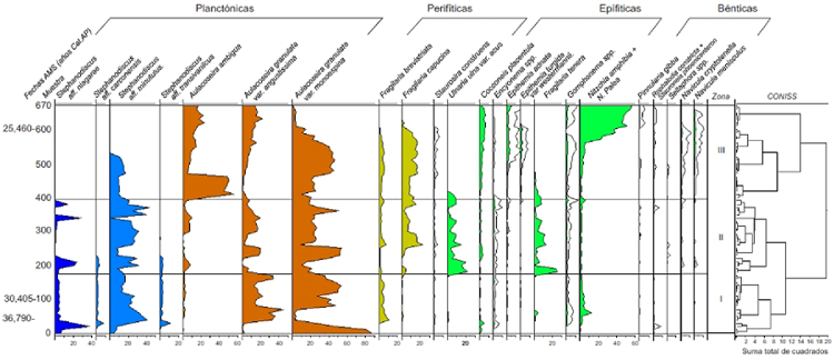 El registro de sedimentación biógena a lo largo de la columna estratigráfica del yacimiento se realizó por zonas, de acuerdo a los cambios observados en la sucesión estratigráfica, las cuales corresponden con el ordenamiento que realiza el programa CONISS (Figura 6).