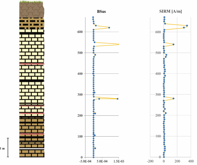 Los sedimentos lacustres presentan una respuesta magnética relativamente débil debido a la baja concentración de minerales magnéticos. No obstante, la sensibilidad de los equipos utilizados (Kappabridge y magnetómetro de giro JR6) permitieron graficar las variaciones de susceptibilidad magnética y magnetización de saturación (SIRM) vs altura (Figura 7).