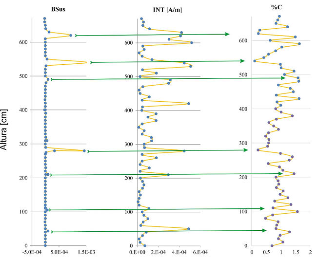 En los registros de susceptibilidad magnética contra la altura (Figura 8) se observan al menos cuatro máximos (picos) a 50, 110, 280 y 320 cm, los cuales se relacionan directamente con máximos de intensidad y porcentaje de carbono (%C). En el mismo registro también se observan otros dos máximos en susceptibilidad magnética e intensidad que presentan, sin embargo, una relación inversa con mínimos de %C a 540 y 620 cm.