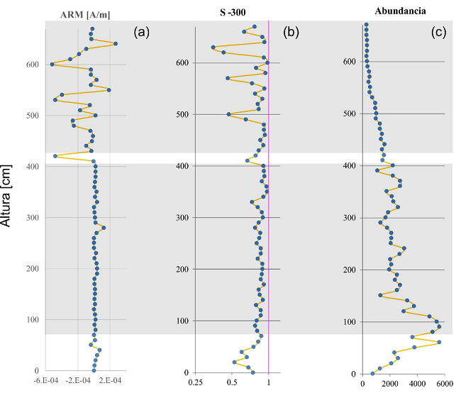 La comparación de las gráficas de ARM vs altura y del parámetro S300 vs altura contra la abundancia de diatomeas (Figura 9) permite la identificación de dos intervalos característicos de la secuencia sedimentaria: el primero, de 60 cm a 400 cm, en el cual tanto la ARM, cuanto el cociente S300, se mantienen casi constantes, mientras que la abundancia de diatomeas presenta una disminución significativa del 66%, al pasar de 6000 a 2000 frústulas. Por el contrario, en el segundo intervalo (420 cm a 670 cm) la variabilidad se presenta en ambos parámetros magnéticos (ARM y S300) mientras que la abundancia muestra una disminución progresiva.