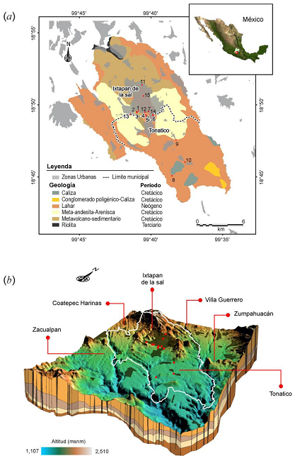 El área de estudio abarca los municipios de Ixtapan de la Sal y Tonatico (Figura 1). Con una extensión territorial de 255 km2, equivalente al 0.92% del territorio estatal, se encuentra ubicada en la zona sur del Estado de México y está enclavada en la cuenca del río Balsas, entre los paralelos 18°55'30" y 18°42'0" de latitud norte y entre los meridianos 99°34'30" y 99°46'53" longitud oeste. El clima, de acuerdo a la clasificación climática de Köppen, es templado subhúmedo hacia el norte (Cwbg), en tanto que, hacia el sur, es semicálido subhúmedo con lluvias en verano (A(C)wg) y lluvia invernal inferior al 5%. Su temperatura media anual oscila entre los 15°C y los 20°C, con una máxima de 31°C y una mínima de 6°C. La presencia de aguas termales en la zona produce un doble efecto: en primer lugar, la generación de un polo de desarrollo, expresado en la inversión en infraestructura para el aprovechamiento de la misma, y, en segundo lugar, y no dependiente del primero, contaminación del agua que podría ser aprovechada para consumo humano, factor, este último, que requiere atención en términos de las implicaciones sanitarias relacionadas, principalmente, a la ocurrencia de arsénico en ellas.