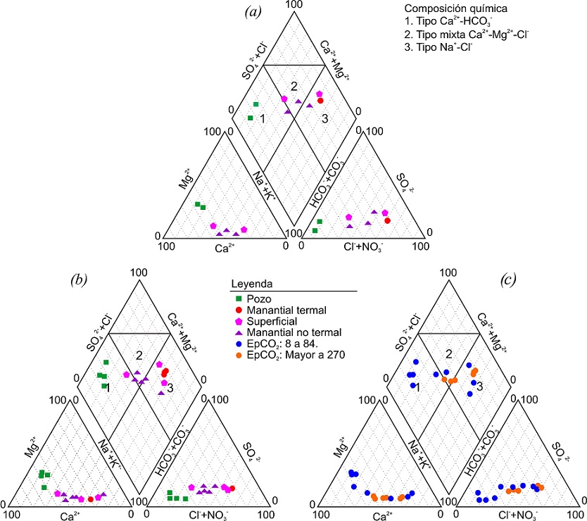 La investigación retomó un enfoque adicional para evaluar el efecto que tiene el EpCO2 en la conformación de las características fisicoquímicas del agua. Para ello la Figura 2c muestra la relación entre la concentración determinada de éste en el agua y su clasificación respecto del diagrama de Piper para 2019 (Figura 2b). En este sentido, y retomando la metodología desarrollada por Jeong (2001), pueden establecerse dos rangos principales: (1) muestras cuyo contenido de EpCO2 oscila entre 8 y 84, que contemplan la totalidad de pozos, tres muestras superficiales y dos manantiales no termales (puntos 3-6, 8-10 y 13-14, Tabla 1) y (2) aquellas muestras con un EpCO2 arriba de los 270, en las que se incluyen tres manantiales considerados no termales y tres procedentes de fuentes termales, que pueden considerarse contaminadas por fuentes geogénicas de la zona y que sustentarían los procesos de mezcla entre dichas fuentes al compartir esta característica común de la alta concentración de EpCO2.