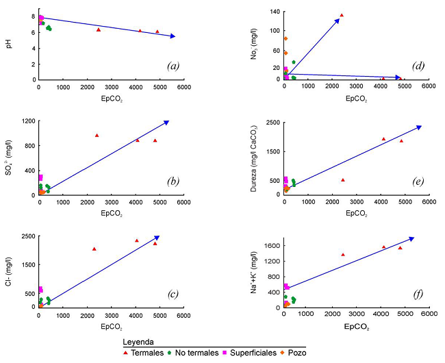 En la Figura 4 puede verse que altos niveles de EpCO2 se corresponden con altos niveles de sulfatos, cloruros, dureza total, y sodio+potasio para las fuentes termales y, en mucha menor proporción, para los otros tipos de fuentes (manantiales no termales, pozos y fuentes superficiales). Los resultados difieren de los obtenidos por Jeong (2001), quien no asigna el alto contenido de CO2 a actividad magmática en su zona de estudio; más bien, encausa su origen a la infiltración de aguas ricas en contaminantes orgánicos. En contraposición a este autor, los resultados registrados en la presente investigación coindicen con los obtenidos por Cerón et al. (1998), quienes determinaron un enriquecimiento en bicarbonatos junto a concentraciones altas de CO2 en aguas termales del sureste de las Cordilleras Béticas. Adicionalmente, este factor determinaba en dicha zona, junto a procesos de dedolomitización, la formación de travertinos que pueden hallarse en ella, algo que se evidencia en algunas áreas de la presente investigación.