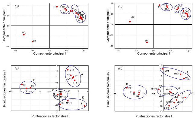 Estos resultados de tendencia estacional son reforzados con los obtenidos por Satyaji-Rao et al. (2010), quienes determinaron una variación significativa de influencia, principalmente para el calcio, en función de los cambios de las condiciones climáticas derivadas de las épocas de muestreo de su investigación. Ellos establecieron, sin lugar a dudas, una relación inherente entre dichas condiciones, expresadas en términos de la precipitación, y las condiciones hidrogeológicas, las cuales, en conjunto, determinan la mayor o menor concentración de los elementos constitutivos del agua en las zonas de estudio y, señalan, las variaciones que tienen lugar en los períodos analizados en la presente investigación (Figura 5a y 5b). De este análisis se desprende que el modo R del Análisis de componentes principales corrobora los procesos ya definidos en la etapa previa de relaciones químicas mostradas. Su aporte radica en destacar, separar e individualizar entre los procesos antropogénicos y geogénicos que determinan la composición química del agua en la zona de estudio e identifican los elementos que en ellos intervienen.