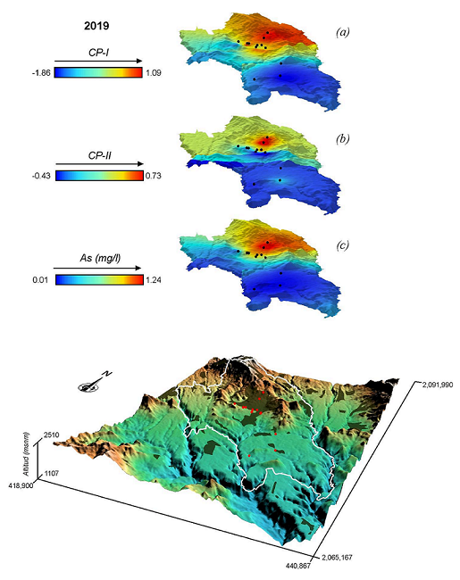 Como elemento de interés, el CP-I está relacionado con el Arsénico (con una carga positiva alta de 0.877). Los resultados presentados en la Tabla 1 demuestran que la presencia de aguas termales en la zona norte está determinando el comportamiento y presencia de arsénico en ella, lo que fue igualmente demostrado en el diagrama de Piper (Figura 2c), es decir, de los procesos de mezcla que tienen lugar en algunas fuentes consideradas no termales, cuya composición tiene características intermedias por el proceso antes mencionado. Consecuentemente, la distribución de este elemento tiene una tendencia decreciente en la dirección noreste-suroeste.