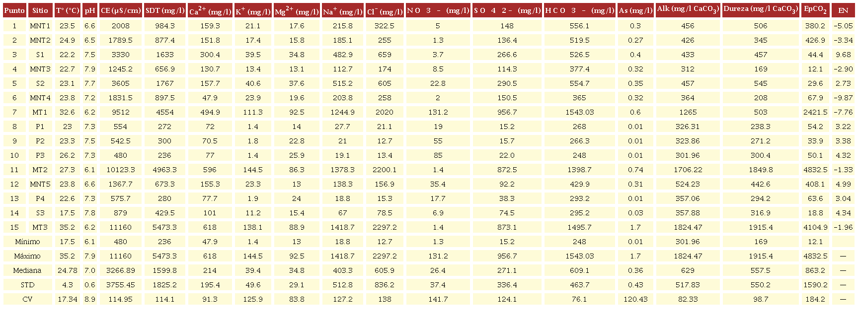 Al revisar el parámetro SDT (Tabla 1), para los tres grupos químicos determinados (Figura 2b), en promedio, éste se cuantifica, respectivamente, en 303.5 mg/l (tipo ), 797.97 mg/l (tipo Ca2+-Mg2+-Cl-) y 3214.68 mg/l (tipo Na+-Cl-), clasificando las aguas como dulces (<1000 mg/l en SDT) y salobres (>1000 mg/l en SDT). De entre estos tres tipos, las muestras de aguas termales, todas ubicadas dentro del tipo Na+-Cl-, son las que presentan las mayores concentraciones de SDT (Tabla 1).