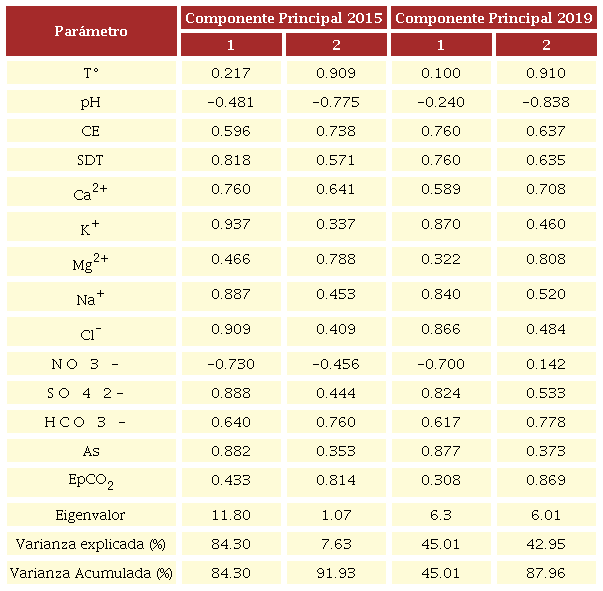 El conjunto de determinaciones fisicoquímicas, de los años 2015 y 2019, fue utilizado como base para el análisis de componentes principales (ACP). Fueron incluidas aquellas variables que representan los elementos mayoritarios disueltos, así como algunos parámetros fisicoquímicos de interés correlacionados con los primeros, con lo que se consideró que podría tenerse una visión más amplia de los procesos geoquímicos que tienen lugar en la zona. Las variables seleccionadas para la realización del ACP fueron: temperatura, pH, conductividad eléctrica, sólidos disueltos totales, y