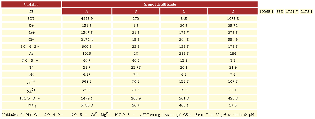El grupo "A" reúne sitios con características termales, con altas tasas de mineralización, elevado contenido de sulfatos, CE, SDT, bicarbonatos y arsénico, manteniéndose, en el tiempo, dentro del polo correspondiente a los elementos de salinidad. Este grupo se corresponde con aguas del tipo Na+-Cl- y presentan, predominantemente, puntuaciones positivas en el CP-I.