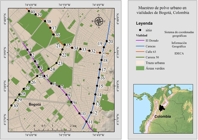Para este estudio fueron seleccionadas cuatro vialidades de la Ciudad de Bogotá, Colombia (Longitud: 74°4'54.3" W y latitud: 4°36'34.96" N). Las muestras fueron recolectadas en febrero de 2016, en vialidades colindantes, las cuales forman un polígono de 21 km2 en la zona urbana (Figura 1).