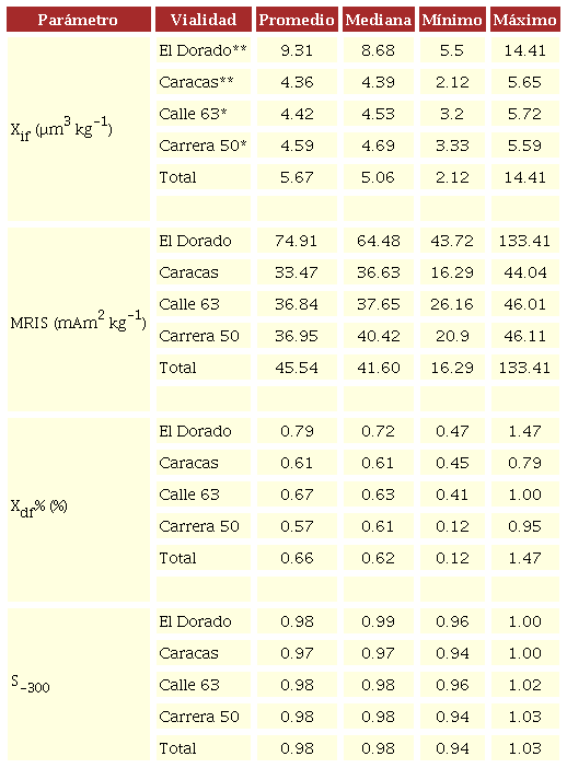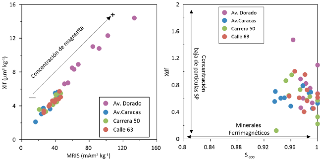 Los parámetros de Xlf y MRIS de las vialidades de transporte público con motor convencional (Carrera 50 y Calle 63) exhibieron valores menores a los encontrados para la vialidad del transporte con motor diesel (Av. El Dorado). Sin embargo, la vialidad Caracas mostró valores de Xlf y MRIS similares a los de Carrera 50 y Calle 63. Este aumento en la concentración material magnético se debe posiblemente, a que por la Av. El Dorado transita una mayor cantidad de vehículos, tiene el doble de carriles de circulación que las otras avenidas y tiene una pendiente < 4° que impide la escorrentía de agua, lo que genera una mayor concentración de material sobre la superficie.