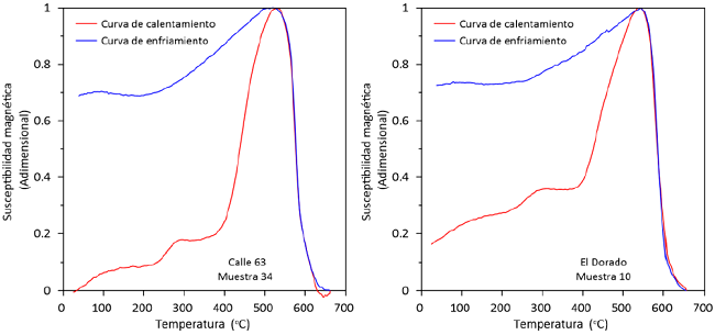 La mineralogía magnética se determinó por medio de las curvas termomagnéticas, las cuales se obtuvieron midiendo la susceptibilidad magnética en función de la temperatura con un medidor de susceptibilidad MFK-2 AGICO. Cada muestra fue calentada desde temperatura ambiente y hasta 600 °C a una razón de 10 °C/min y enfriada con la misma razón. Las fases mineralógicas o temperaturas de Curie (Tc) fueron determinadas por el método diferencial descrito por Tauxe et al., (2018).