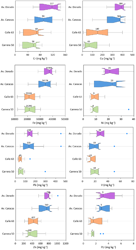 Los resultados de PLI en el PU de las vialidades de Bogotá indicaron que, las cuatro vialidades mostraron valores de PLI>1, por lo que hay contaminación por metales pesados en casi todos los sitios (Figura 4). Se encontraron algunos sitios de las vialidades Carrera 50 y Calle 63 que mostraron valores de PLI ≤ 1 que indican lugares con bajo contenido de metales pesados (Figura 4). Mientras que, las vialidades de Av. Dorado y Caracas mostraron sitios con valores de PLI > 4, por lo que se encuentran altamente contaminadas (Figura 4). De acuerdo con lo reportado para otras ciudades, el desgaste de piezas vehiculares y el uso de combustibles fósiles incrementan la concentración de Fe, Zn, Cr y Pb (Al-Dahabi et al., 2010; Aguilar-Reyes et al., 2011; Cejudo et al., 2015; Liu et al., 2018; Jeong et al., 2020).