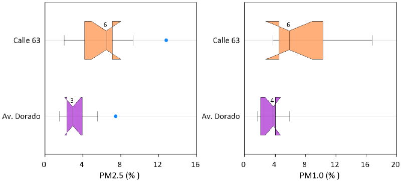 Las muestras de Calle 63 (vialidad con vehículo y transporte con motor a gasolina) exhibieron mayor contenido de partículas finas (PM2.5 y PM1.0) en comparación con las muestras de la Av. El Dorado (vialidad con el transporte público con motor a diesel y vehículos con motor a gasolina, Figura 5). Las concentraciones de partículas finas en ambas vialidades fueron menores al 10% del peso, existe la probabilidad de que el clima haya contribuido a la baja concentración (viento), dado que el muestreo fue hecho durante la época de sequía.