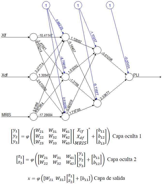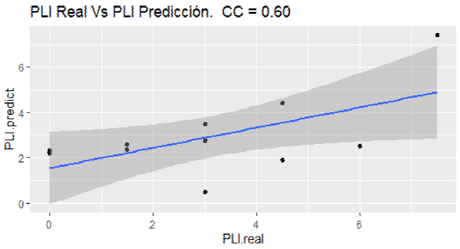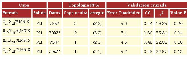 La precisión del modelo de la RNA se evaluó por medio de los parámetros de correlación lineal obtenida entre el valor estimado y el valor medido del valor de PLI. Los análisis estadísticos y modelación de RNA se hicieron con el software R (Ihaka y Gentleman, 1996).