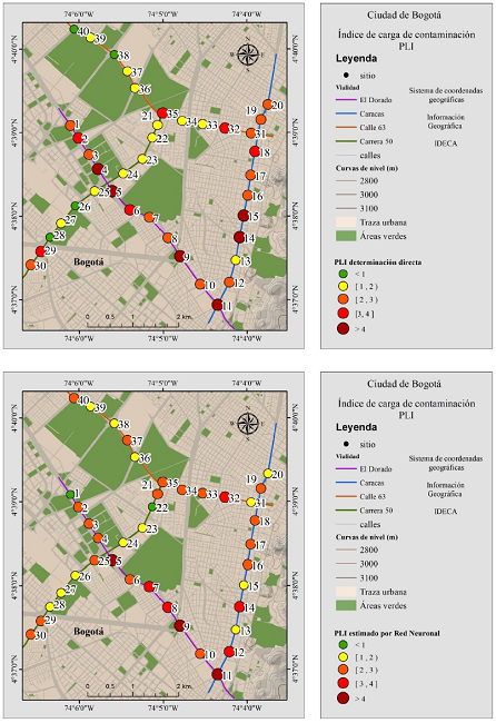 Las vialidades de Bogotá que mostraron valores de PLI > 3 fueron por donde circula el transporte con motor a diesel (Av. El Dorado y Caracas), el área donde hay intersección con otras avenidas incrementan el valor de PLI (Figura 8). Los sitios de la avenida Caracas (sitios de 14 a 17) que estuvieron cerca de la zona de escorrentía en la parte este de la Ciudad, mostró valores PLI > 3, pero disminuyen el valor de PLI conforme se aleja de las partes altas, por lo que se infiere que el factor geográfico contribuye al incremento de valores de PLI (Figura 8), probablemente por material transportado por escorrentía de las áreas altas. Los sitios de las vialidades, por donde circula el transporte público con motor a gasolina presentaron valores de PLI entre 1 y 2, por lo que estos sitios se encuentran moderadamente contaminados por metales pesados (Figura 8). Los valores estimados de PLI con el modelo de red neuronal mostraron similitudes con los valores calculado de PLI obtenidos por las concentraciones. Sin embargo, se observó que la red neuronal estima un número mayor de sitios con valores de PLI más altos, tal es el caso de la Calle 63, en donde se observó sitios con valores de PLI estimados entre 2 y 3, en comparación con los valores de PLI determinados de 1 a 3 (Figura 8).