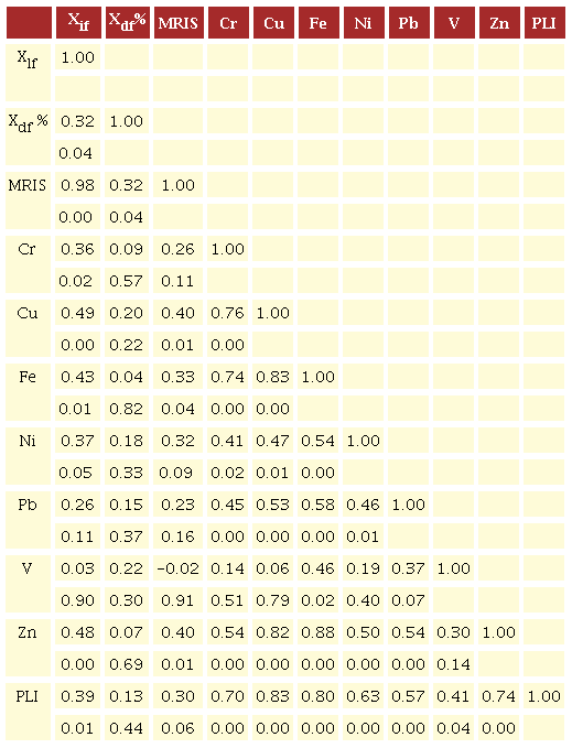 Las correlaciones lineales entre los parámetros magnéticos Xlf, SIRM, Xdf% y el contenido de Cr, Cu Fe y Zn exhibieron un coeficiente de correlación (CC)> 0.3 y valor de p <0.05, indican correlaciones significativas con un nivel de confianza del 95% (Tabla 2). El valor de PLI mostró un CC<0.39 para los parámetros magnéticos de Xlf y MRIS (Tabla 2).