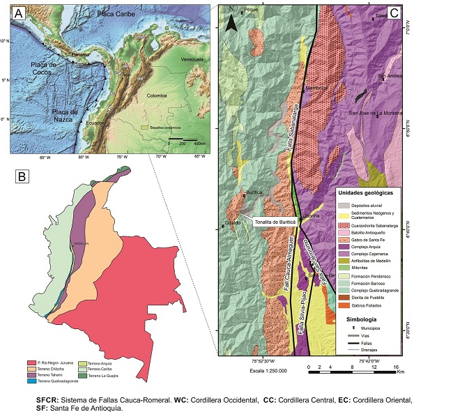 Las rocas agrupadas bajo la denominación "Batolito de Sabanalarga" se localizan en la zona de confluencia de 4 terrenos geológicos (Caribe, Arquía, Quebradagrande y Tahamí (Gómez et al., 2015)), y del sistema de fallas Cauca-Romeral (SFCR), sistema de fallas que se extiende a lo largo de 2000 km desde el norte de Antioquia hasta el sur en Ecuador (Figura 1A; Villagómez, 2010). A continuación, se describen las principales características de cada uno de estos elementos geológicos para determinar las posibles relaciones de los mismos con el Batolito de Sabanalarga.