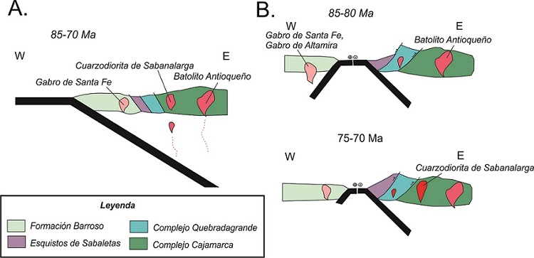 Las rápidas tasas de exhumación entre 80-73 Ma del Norte de Suramérica (Villagómez y Spikings, 2013), los cambios en la sedimentación de las cuencas tras arco (Villamil, 1999; Bayona, 2018), y un cambio importante en la composición del magmatismo del arco continental en la Cordillera Central c.a 73 Ma (Jaramillo et al., 2017), sugieren una colisión de un arco oceánico y un arco continental (Jaramillo et al., 2017, Pardo-Trujillo et al., 2020). Además, el registro estratigráfico y proveniencia de parte del Miembro Urrao, que suprayase facies vulcanoclasticas de la Formación Barroso, es también coetáneo con la colisión de ambos arcos (Pardo-Trujillo et al., 2020).