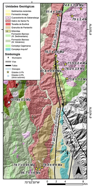 Asimismo, relaciones de campo evidenciadas durante la cartografía geológica permitieron identificar dos bloques tectónicos autónomos, intruidos por plutones de diferente composición y edad similar a ambos márgenes de la Falla Sabanalarga. Los análisis demostraron que, al este la Cuarzodiorita de Sabanalarga, un cuerpo de composición principalmente tonalita y con edades ígneas de 76.7±2.4, 85.4±2.4, 74.6±7.6, 76.2±3.4, 71.6±1.2, 71.5±2.4 Ma, intruye rocas metamórficas en facie esquisto verde asociadas al Complejo Cajamarca (terreno Tahami). Del mismo modo, al oeste el Gabro de Santa Fe de composición gabro-gabrodiorita y con edades ígneas de 79.71±0.85, 86.7±1.6, 81.86±0.61, 78.4±6.4, 79±2.4, 79±14, 81.4±2 Ma, se encuentra intruyendo rocas volcánicas básicas de ambiente oceánico de la Formación Barroso (terreno Caribe) y con algunos cuerpos de xenolitos en facie granulita de la Anfibolita de Pantanillo (Cardona, 2010; Rodríguez et al., 2012), con edades de cristalización de 87.9±1.7, 84.2±0.69 y 80.9±1.2 Ma (Correa et al., 2018) y asociados a las raíces del arco volcánico engrosado (Toro-Toro et al., 2020) .